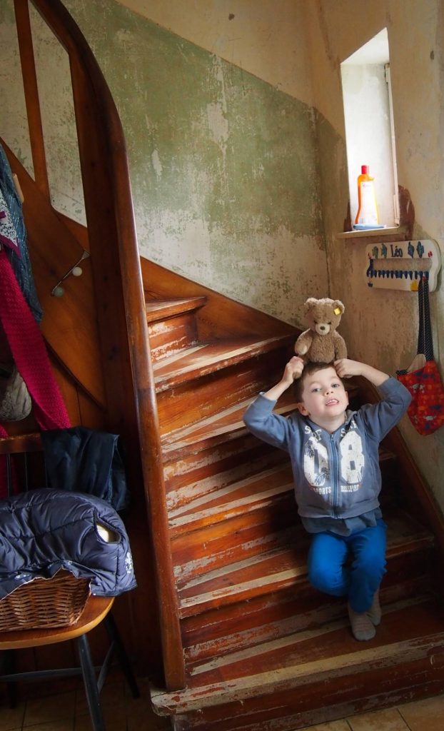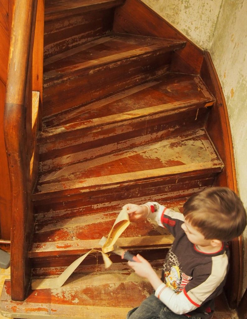 Aber immerhin konnte ich Fabien irgendwann überzeugen, dass ich den schrecklichen Teppich von der Treppe entfernen durfte. Er hätte ihn gerne zum Schutz bei Bauarbeiten auf dem Dachboden noch draufgelassen. Da es aber nicht absehbar war, wann diese stattfinden/abgeschlossen sein würden, machten Léo und ich uns daran, immerhin schon mal die Treppe zu verschönern.